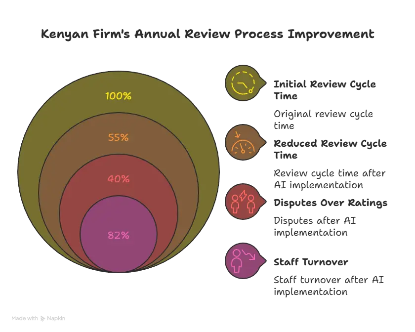 The Scenario: A mid-sized Kenyan manufacturing firm with 120 employees found that its annual review process was causing delays, low engagement and recurring disputes about fairness. Managers manually compiled feedback, spreadsheets were out of date before approval, and employees said they didn’t clearly understand how ratings were derived.